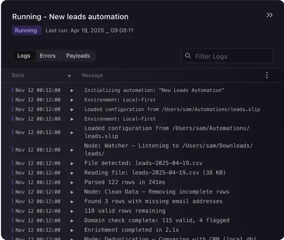 Transparent Execution LogsEvery run is tracked in detail - from inputs to outputs to runtime errors. Perfect for debugging and transparency.